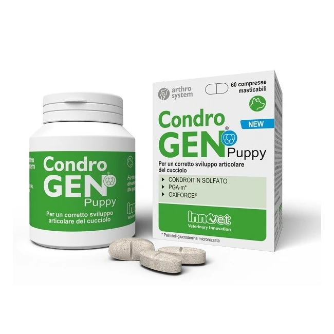 CondroGEN Puppy è un mangime complementare progettato per supportare lo sviluppo articolare ottimale dei cuccioli di razze grandi e giganti. Questo prodotto è ideale per garantire una crescita sana e un benessere duraturo nel corso delle fasi di accrescimento.A cosa serve