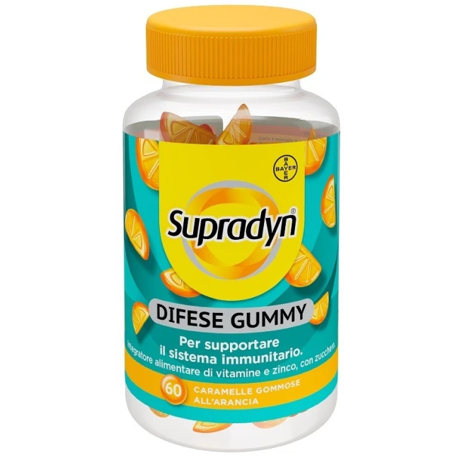 Bayer Supradyn Difese Gummy è un integratore innovativo formulato per compensare le carenze vitaminiche e soddisfare l'accresciuto fabbisogno di nutrienti. Ogni caramella gommosa unisce il gusto delizioso alla funzionalità, rendendo più semplice l'assunzione quotidiana di vitamine.A cosa serve