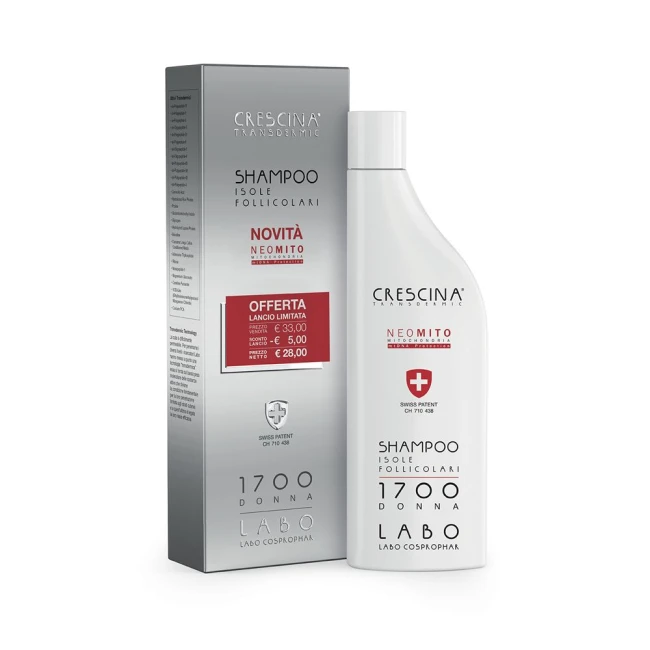 Crescina Shampoo Isole Follicolari Neo‑Mito 1700 Donna è formulato come coadiuvante cosmetico per contrastare il diradamento femminile, integrandosi con i trattamenti topici in fiale di Crescina Neo‑Mito. Gli ingredienti principali includono il complesso HFSC (che contiene cisteina, lisina, glicoproteina, proteine di riso idrolizzate e acido corosolico), il complesso Isole Follicolari, l’Hair Booster 177 (basato su colture/estratti di Curcuma Longa) e il complesso Neo‑MITO, che comprende Nonapeptide‑1, Magnesio Gluconato, Carnitina Fumarato, una attività “SOD‑Like” e Calcium PCA, utili per sostenere il metabolismo mitocondriale del follicolo. Contiene anche molecole “Plate‑Like” (12 tipi), che imitano peptidi naturali presenti nel capello, oltre a ATP e Ribosio per fornire energia cellulare. Lo Scalp Microbiome Complex aiuta a mantenere l’equilibrio del microbioma del cuoio capelluto, condizione fondamentale per l’azione efficace degli altri attivi.