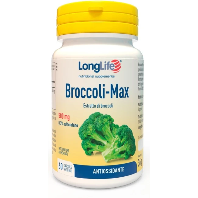 LongLife Broccoli Max è un prodotto ad alto contenuto di sulforafano, un potente isotiocianato. Ogni capsula fornisce 500 mg di estratto secco di broccoli, standardizzato per garantire un contenuto di sulforafano non inferiore allo 0,3%.Adatto per