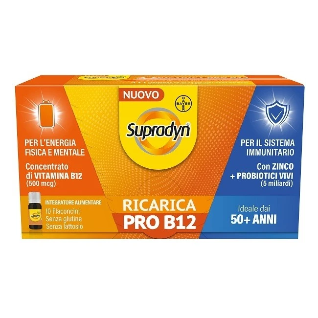 Bayer Supradyn Ricarica Pro B12 è un integratore alimentare ad alto dosaggio di vitamina B12 che supporta la riduzione dell'affaticamento e il metabolismo energetico.