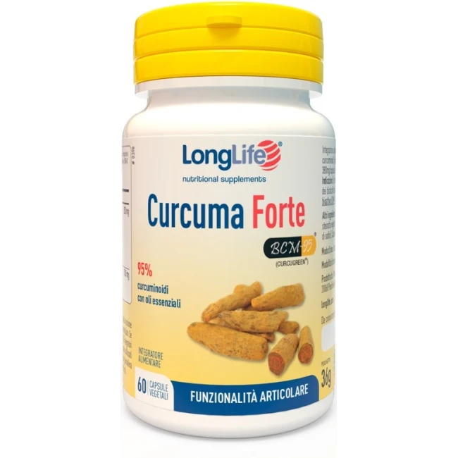 Longlife Curcuma Forte contiene una miscela sinergica e brevettata di curcuminoidi, tra cui curcumina, demetossicurcumina e bisdemetossicurcumina, ed oli essenziali di Curcuma longa L. Il bioattivo BCM-95 migliora la biodisponibilità dell'estratto di curcuma, rendendolo 7 volte più efficace.Adatto per