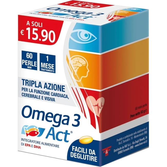 F&F Omega 3 Act è un integratore alimentare di alta qualità, formulato per fornire un apporto ottimale di EPA e DHA, due acidi grassi essenziali per la salute dell'organismo.A cosa serve