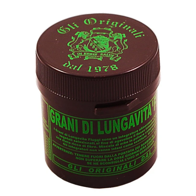 I grani di lungavita "fiuggi" sono un integratore alimentare a base di componenti vegetali selezionati. Senna, Frangula, Rabarbaro e Cannella favoriscono la regolarità del transito intestinale, associati ad una dieta ricca di fibre. Miscela di erbe in polvere compressate ed essiccate.
