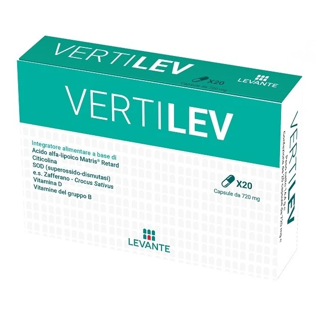 Levante Vertilev è formulato con una combinazione di ingredienti chiave come Acido alfa-lipoico, Citicolina e SOD (superossido-dismutasi), che lavorano in sinergia per promuovere la salute neurologica. È privo di glutine e naturalmente privo di lattosio.