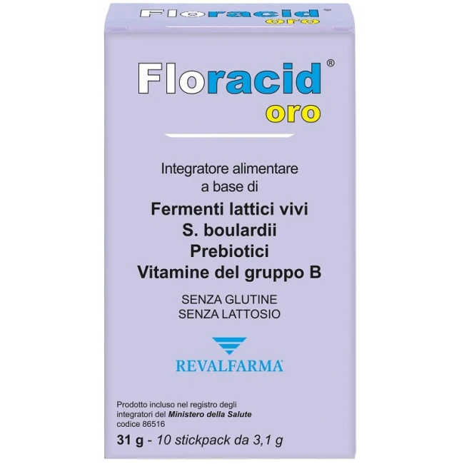 Revalfarma Floracid si presenta in pratici stickpack che ne facilitano l'assunzione. Ogni stickpack contiene una miscela bilanciata di fermenti lattici, prebiotici e vitamine, senza glutine e lattosio.Adatto per