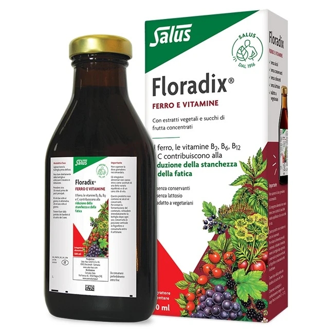 Floradix contiene ferro in forma di gluconato ferroso, noto per la sua elevata biodisponibilità. Inoltre, include vitamine B2, B6, B12 e C, che favoriscono l’assorbimento del ferro e contribuiscono al metabolismo energetico.Adatto per