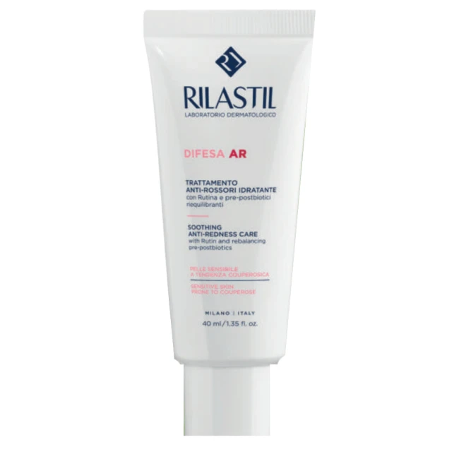 Rilastil Difesa AR è un trattamento idratante e anti-rossori specificamente formulato per pelli sensibili a tendenza couperosica, con capillari visibili, teleangectasie e rossori diffusi o localizzati.