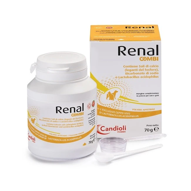 Formula ricca di sostanze benefiche, Renal Combi contiene carbonato di calcio, gluconato di lattato di calcio, chitosano, e bicarbonato di sodio. È arricchito con fruttoligosaccaridi e polifenoli dell'olio d'oliva che supportano le difese antiossidanti dell'organismo.Adatto per