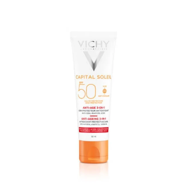 La crema solare antietà Vichy Idéal Soleil SPF 50 è un trattamento 3 in 1 che protegge, illumina e migliora visibilmente la pelle. Pensata per fototipi chiari e per chi desidera prevenire i segni del tempo, è arricchita con potenti attivi antiossidanti e lenitivi. Dermatologicamente testata, è ipoallergenica e ideale per pelli sensibili.