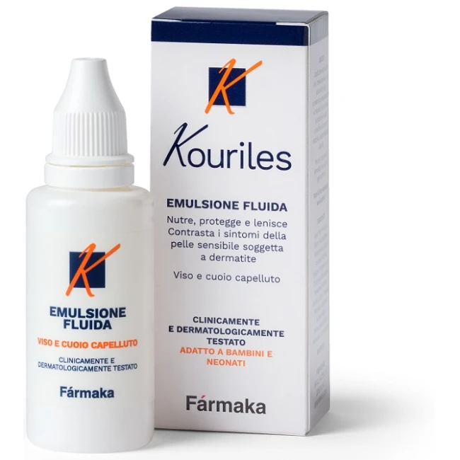 - Kouriles Emulsione è formulata per lenire, idratare e proteggere la pelle sensibile, riducendo i sintomi tipici della dermatite;