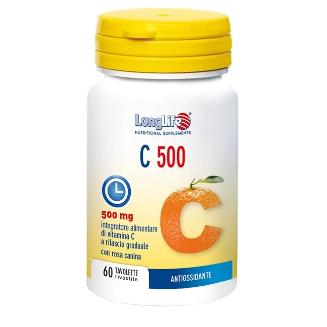 Longlife C 500 è un integratore alimentare specificamente formulato per supportare il sistema immunitario e contribuire alla salute generale dell'organismo grazie alla presenza di vitamina C e rosa canina.A cosa serve