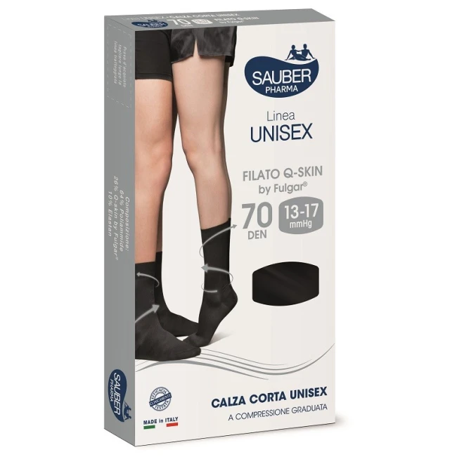 Le calze corte Sauber Linea Unisex 13-17 mmHg sono studiate per offrire il massimo comfort unito a un'efficace azione a compressione graduata, favorendo la circolazione sanguigna e il drenaggio linfatico e, realizzate con filato Q-Skin, un materiale innovativo che assicura traspirabilità e controllo della proliferazione batterica, garantiscono benessere e freschezza durante tutta la giornata.