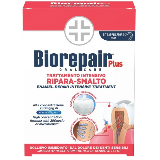 Biorepair Trattamento Intensivo Riparatore Smalto è un trattamento cosmetico che supporta la riparazione dello smalto dentale e la riduzione della sensibilità.