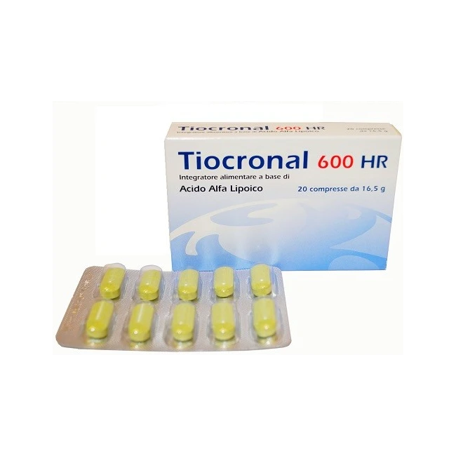 Il principio attivo principale di Tiocronal 600 HR è l’acido alfa lipoico, noto per la sua funzione antiossidante e il supporto metabolico.