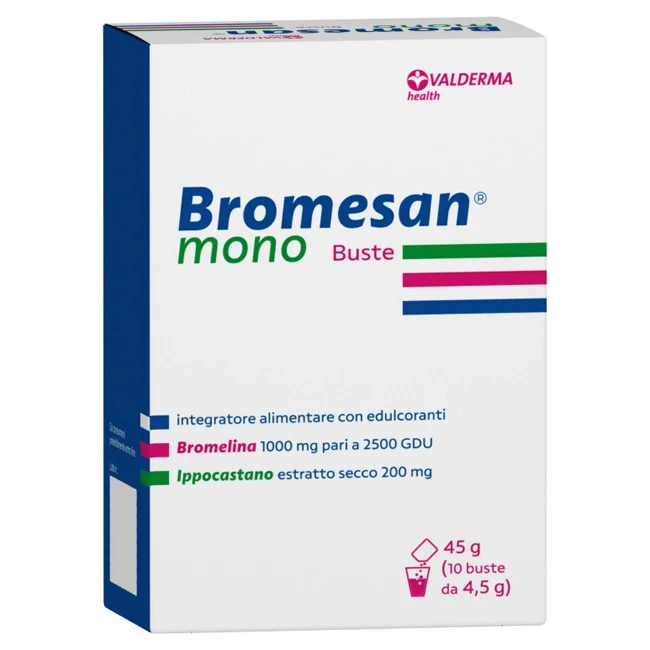 Ogni busta di Valderma Bromesan Mono contiene 1.000 mg di bromelina, fornendo un'attività enzimatica di 2.500 GDU, insieme a 200 mg di estratto secco di ippocastano titolato in escina.Adatto per