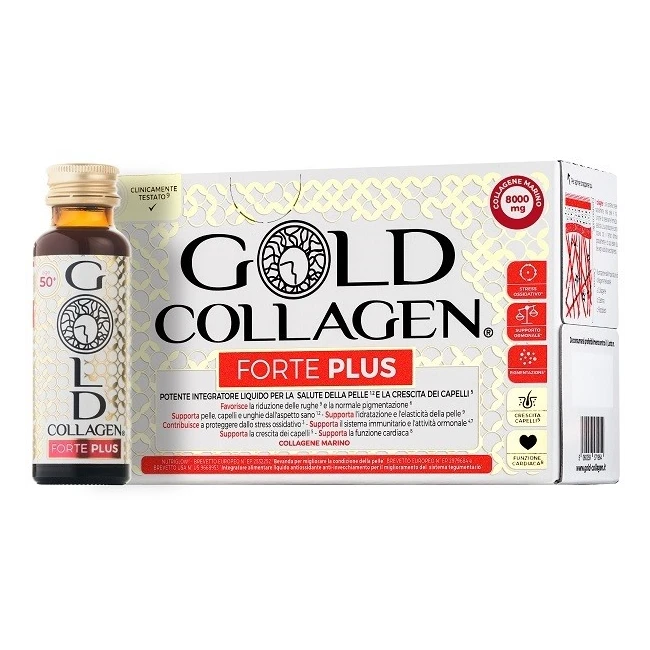 Gold Collagen Forte Plus è un integratore alimentare che fornisce un supporto nutrizionale avanzato per la pelle, i capelli e le unghie. Formulato con 23 ingredienti attivi, questo prodotto rappresenta una soluzione efficace per promuovere un aspetto sano e luminosa. La combinazione unica di collagene marino idrolizzato, vitamine e minerali favorisce la normale formazione di collagene e contribuisce al mantenimento della salute di pelle e capelli.