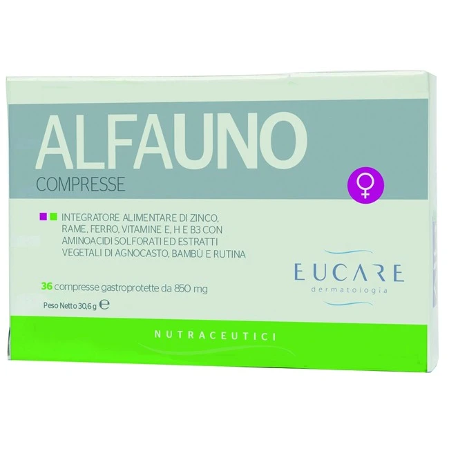 Eucare Alfauno è caratterizzato da una miscela di zinco, rame, ferro, e vitamine H, E e B3, accompagnati da aminoacidi solforati e estratti vegetali come agnocasto, bambù e rutina.