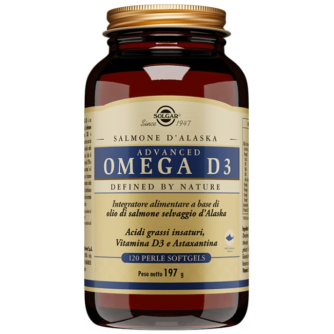 Solgar Advanced Omega D3 è un integratore alimentare formulato con olio di salmone selvaggio dell'Alaska, ricco di acidi grassi polinsaturi, in combinazione con vitamina D3 e astaxantina. Questo prodotto offre un ampio spettro di acidi grassi omega (3, 5, 6, 7, 9) e un elevato rapporto omega-3/omega-6, essenziale per bilanciare l'apporto di omega-6 nella dieta. Grazie alla presenza di EPA e DHA, questo integratore contribuisce al mantenimento della normale funzione cardiaca, del cervello e della vista, mentre la vitamina D3 supporta la salute di ossa e denti, la funzione muscolare e il sistema immunitario.