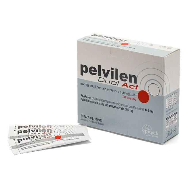 Epitech Pelvilen Dual Act si presenta in bustine di microgranuli facili da assumere e si distingue per la sua formulazione unica, composta da palmitoiletanolamide ultra-micronizzata e micronizzata, che favoriscono l’assorbimento dei principi attivi.