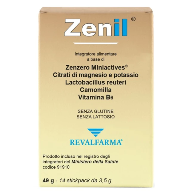 Revalfarma Zenil è un integratore alimentare pratico e facile da assumere, formulato per sostenere il benessere digestivo e per alleviare la tensione. Ogni bustina contiene una combinazione unica di ingredienti, tra cui l'estratto secco di zenzero microincapsulato Miniactives, citrati di magnesio e potassio, Lactobacillus reuteri, estratto secco di camomilla e vitamina B6.