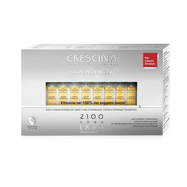 Crescina Isole Follicolari Super Formula 2100 Uomo è un trattamento cosmetico topico ad alta concentrazione, studiato per contrastare il diradamento avanzato nei capelli maschili. Agisce stimolando la ricrescita fisiologica dei capelli ancora vitali, rinforzando i follicoli e supportando la salute del cuoio capelluto.