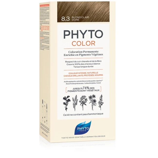 Phytocolor 8.3 è una colorazione permanente senza ammoniaca che unisce l'efficacia dei pigmenti vegetali all'esperienza dei laboratori Phyto il cui colore biondo chiaro dorato dona riflessi naturali e luminosi, garantendo una copertura totale dei capelli bianchi fin dalla prima applicazione.