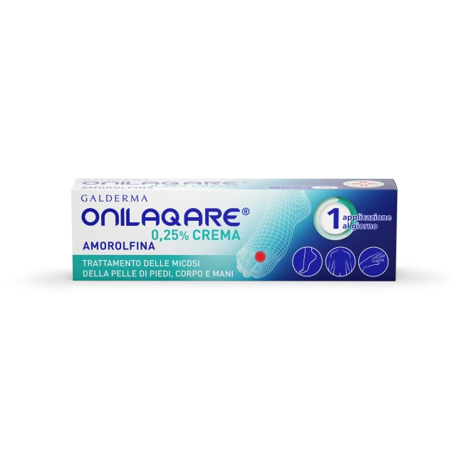 ONILAQARE 0,25% crema contiene amorolfina, una sostanza attiva capace di inibire la crescita dei funghi (antimicotico). E' indicato per il trattamento delle dermatomicosi (infezioni della pelle causate da funghi) come: Tinea pedis (piede d'atleta), Tinea cruris (infezione localizzata a livello delle zone umide come interno coscia, glutei), Tinea inguinalis (infezione dell'inguine), Tinea corporis (infezione che colpisce tutte le altre zone del corpo), Tinea manuum (infezione che colpisce il palmo della mano e la pelle fra le dita), Candidosi cutanee (infezioni della cute da lieviti), Pityriasis versicolor (fungo da spiaggia).
