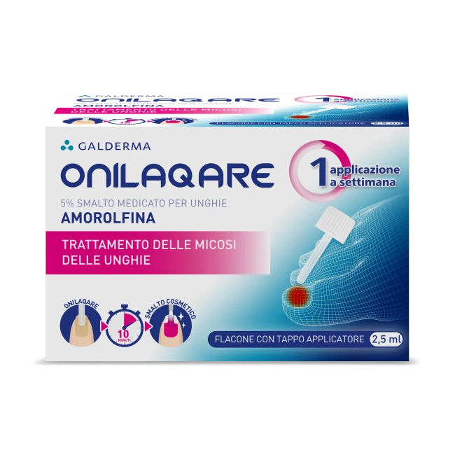 Onilaqare 5% è uno smalto medicato per unghie indicato nel trattamento locale delle onicomicosi leggere causate da funghi dermatofiti, lieviti e muffe il cui principio attivo, amorolfina, è un antimicotico ad ampio spettro che agisce inibendo la crescita dei microrganismi fungini.