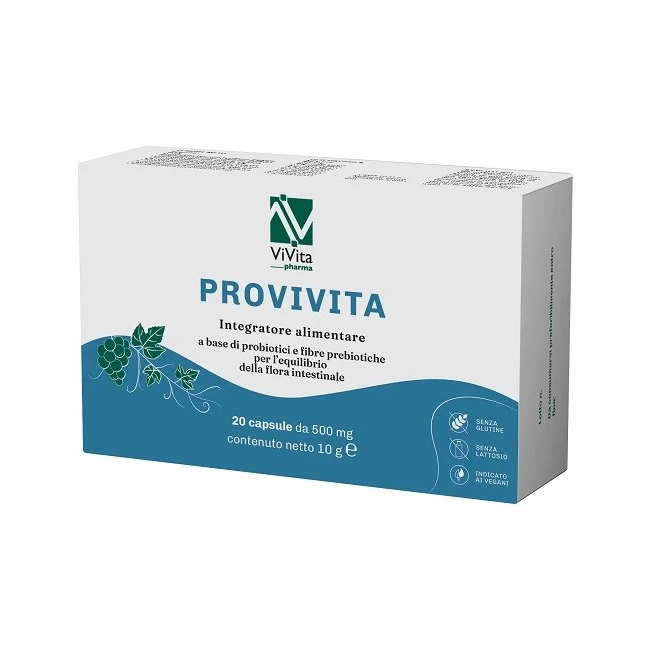 Integratore alimentare costituito da 9 diversi microrganismi probiotici, in forma gastroprotetta, associato a fibre prebiotiche, frutto-olisaccaridi (FOS) e inulina. Una formulazione completa per favorire l’equilibrio della flora batterica intestinale. Consigliato in tutti i casi di disbiosi intestinale associata a stitichezza, diarrea, assunzione di antibiotici o alimentazione scorretta. Garantisce un’azione efficace e completa perché ogni capsula contiene numerosi ceppi batterici e 22,5 miliardi di microrganismi vivi. Le fibre prebiotiche oltre a migliorare l’azione dei probiotici, stimolano la crescita di diversi batteri “buoni”. PROVIVITA aiuta a ridurre il dolore addominale, il gonfiore, eventualmente diarrea se presente.