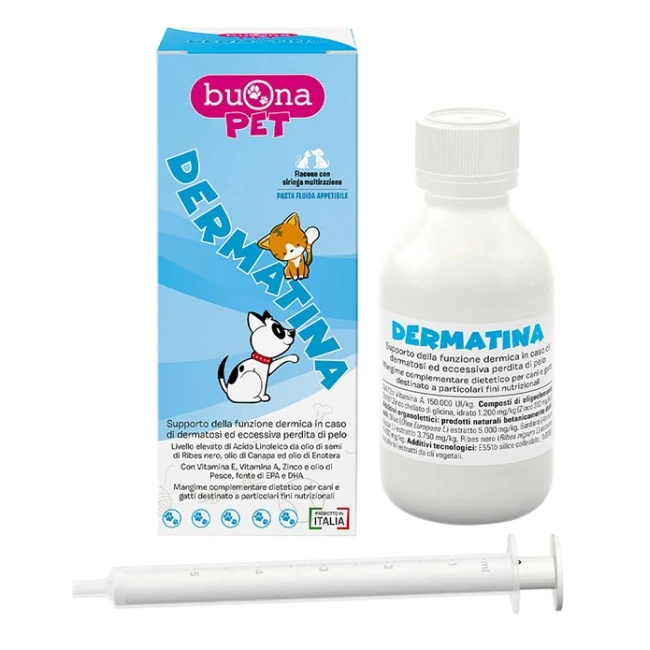 DERMATINA FLACONE è formulato in pasta appetibile con un livello elevato di Acido Linoleico da oli vegetali (olio di semi di Ribes nero, Canapa, Enotera), somma di acido eicosapentaenoico (EPA) e di acido docosaesaenoico (DHA), ed estratti di Olivo, Bardana e Ribes. Il contenuto in Vitamina E, Vitamina A e Zinco favorisce il normale trofismo di cute ed annessi cutanei. L’utilizzo della siringa multirazione consente un’accurata e facile somministrazione quotidiana.