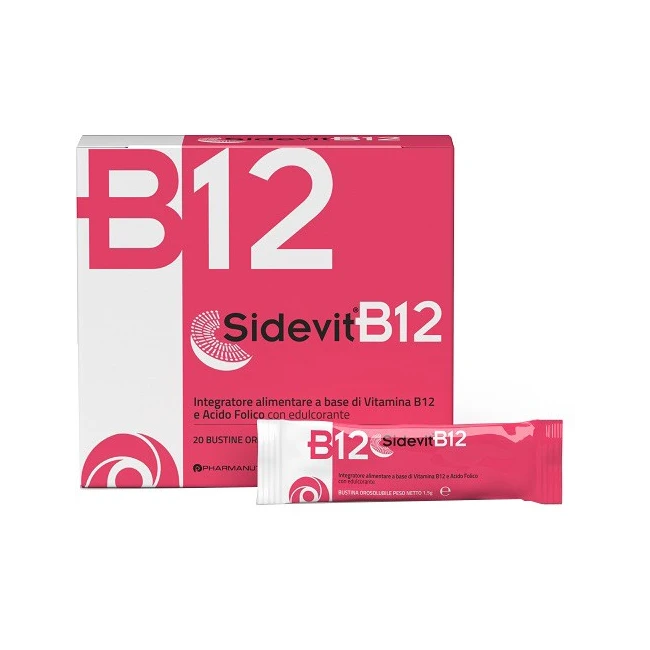Integratore alimentare a base di UltraB12-vitamina B12 sucrosomiale e acido folico (Quatrefolic), utile per colmare le carenze alimentari o gli aumentati fabbisogni organici di questi nutrienti. Sidevit B12, grazie alla presenza di vitamina B12 e acido folico, contribuisce alla riduzione di stanchezza ed affaticamento. Inoltre, grazie alla vitamina B12 contribuisce al normale metabolismo energetico.