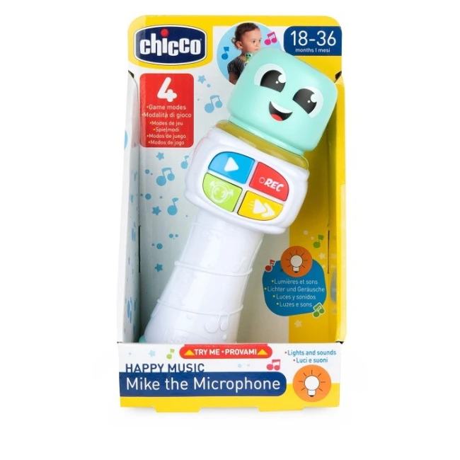 Chicco Mike il Microfono è un gioco musicale interattivo pensato per stimolare la creatività e la socializzazione nei bambini tra i 18 mesi e i 3 anni.