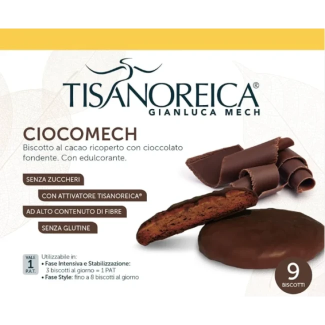 Tisanoreica Ciocomech è un delizioso biscotto proteico al cacao, ricoperto di cioccolato e dolcificato con edulcoranti, ideale per chi segue un’alimentazione a ridotto contenuto di zuccheri o un regime iperproteico.