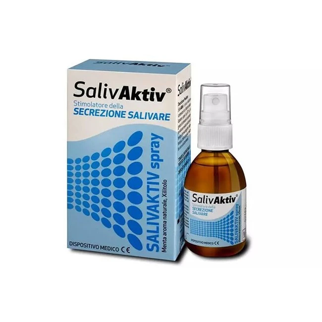 SalivAktiv è una soluzione contenuta in un flacone nebulizzatore spray da 50 ml, in grado di stimolare la secrezione salivare.