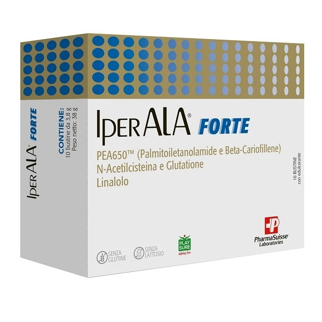 Iperala forte è un integratore alimentare a base di PEA650, associazione di Palmitoiletanolamide (PEA) e beta-cariofillene (da estratto di pepe nero), N-acetilcisteina, glutatione, vitamina C e linalolo (da estratto di coriandolo), utile in caso di ridotto apporto con la dieta o aumentato fabbisogno di tali nutrienti. Il coriandolo ha azione antiossidante. La vitamina C contribuisce al normale funzionamento del sistema nervoso, alla riduzione della stanchezza e dell’affaticamento e al normale metabolismo energetico.