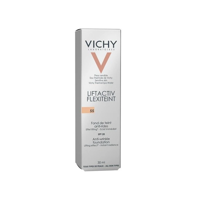 Vichy Liftactiv Flexiteint 55 è il fondotinta anti-età fluido progettato per le donne che desiderano un make-up dall'effetto lifting immediato e dalla finitura luminosa e naturale la cui formula arricchita con Collagyl, un complesso anti-rughe esclusivo di Vichy, contribuisce a migliorare visibilmente l’aspetto delle rughe e delle linee sottili.