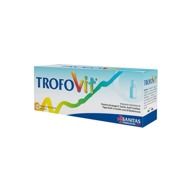 integratore alimentare a base di vitamine del gruppo B, taurina, acetil carnitina, pappa reale ed estratto secco di eleuterococco.I componenti di Trofovit possono essere un siologico supporto in caso di debolezza, a aticamento, stanchezza, calo della concentrazione, dovuti a stress, cambio di stagione, convalescenza, inizio scuola e/o esami.