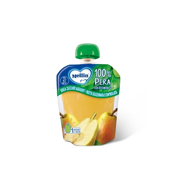 Danone Mellin 100% Pera è una merenda pastorizzata a base di pura frutta, pensata per i più piccoli a partire dal sesto mese compiuto, salvo diverso parere del pediatra.