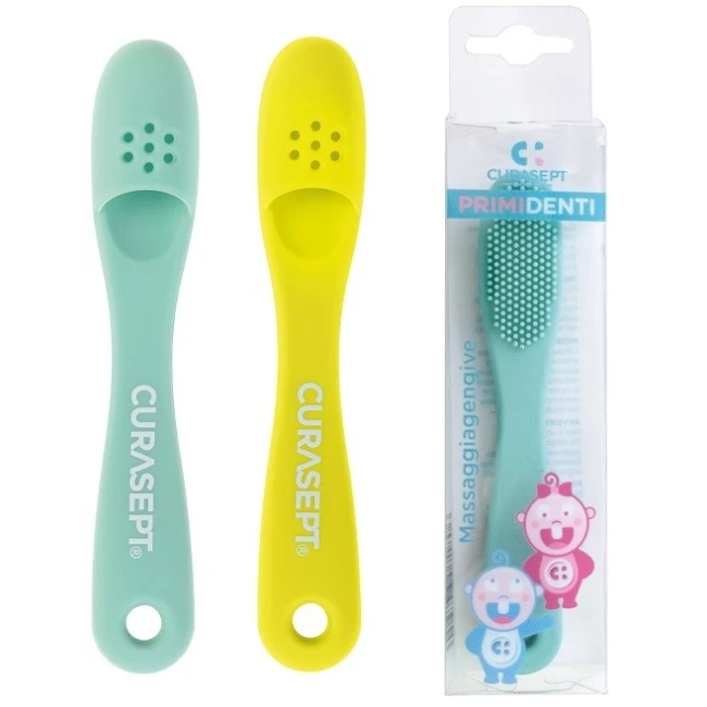 Massaggiagengive privo di BPA e BPS, impugnatura ergonomica antiscivolo, asola per utilizzo con il dito, ideale per l'applicazione del gel.