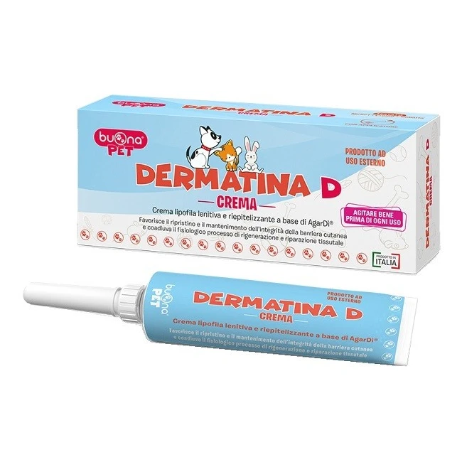 Dermatina D favorisce il ripristino del naturale film idrolipidico cutaneo ed il mantenimento dell’integrità della funzione barriera cutanea. Risulta utile nel trattamento lenitivo di problemi dermatologici quali irritazioni ed arrossamenti (sfregamento tra le pieghe cutanee, punture di parassiti o insetti) ed in caso di screpolature o secchezza dell’epidermide per esposizione ad agenti ambientali (freddo, caldo, allergeni).