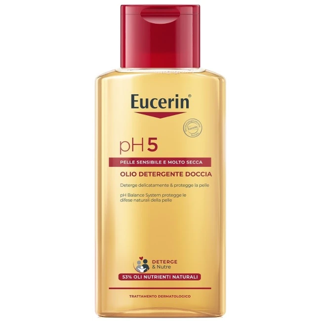 Per la detersione quotidiana della pelle sensibile, secca o facilmente irritabile, Eucerin pH5 Olio Detergente Doccia Grazie alla sua soffice schiuma e alla consistenza oleosa, è ideale anche in caso di lavaggi frequenti. Adatto per adulti e bambini sopra i 3 anni, è pensato per l’uso quotidiano su tutti i tipi di pelle, comprese quelle a tendenza allergica.