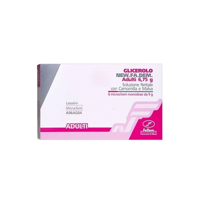 - GLICEROLO New.Fa.Dem. bambini 2,25 soluzione rettale con camomilla e malva. GLICEROLO New.Fa.Dem. adulti 6,75 g soluzione rettale con camomilla e malva.
