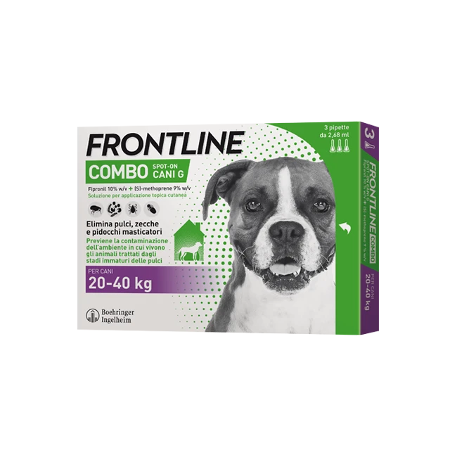 Per il trattamento dei cani di peso compreso tra i 20 e i 40 kg: da utilizzare nei confronti delle infestazioni da pulci, zecche e pidocchi masticatori. Trattamento delle infestazioni da pulci (Ctenocephalides spp.). L'attivita' insetticida nei confronti di nuove infestazioni da pulci adulte persiste per 8 settimane. Previene la moltiplicazione delle pulci inibendo lo sviluppo delle uova (attivita' ovicida), delle pupe e delle larve (attivita' larvicida) nate dalle uova deposte dalle pulci adulte, per 8 settimane dopo l'applicazione. Trattamento delle infestazioni da zecche (Ixodes ricinus, Dermacentor variabilis, Dermacentor reticulatus, Rhipicephalus sanguineus). Il prodotto ha un'attivita' nei confronti delle zecche persistente fino a 4 settimane. Trattamento delle infestazioni da pidocchi masticatori (Trichodectes canis). FRONTLINE COMBO SPOT-ON CANI G puo' essere utilizzato nel programma per il controllo della Dermatite Allergica da Pulce (DAP).