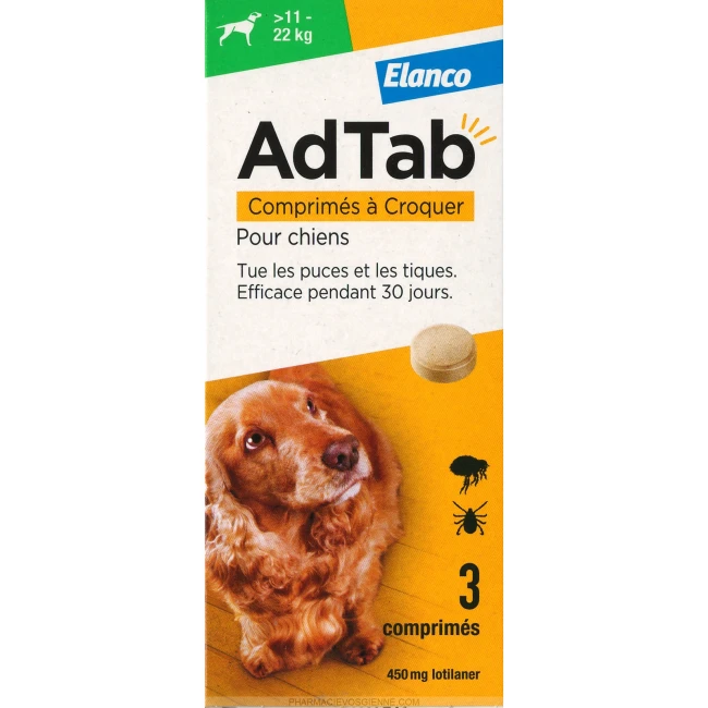 Sostanza attiva: compressa masticabile. AdTab compresse masticabili per cani (1,3-2,5 kg). Lotilaner: 56,25 mg. AdTab compresse masticabili per cani (>2,5-5,5 kg). Lotilaner: 112,5 mg. AdTab compresse masticabili per cani (>5,5-11 kg). Lotilaner: 225 mg. AdTab compresse masticabili per cani (>11-22 kg). Lotilaner: 450 mg. AdTab compresse masticabili per cani (>22 -45 kg). Lotilaner: 900 mg.