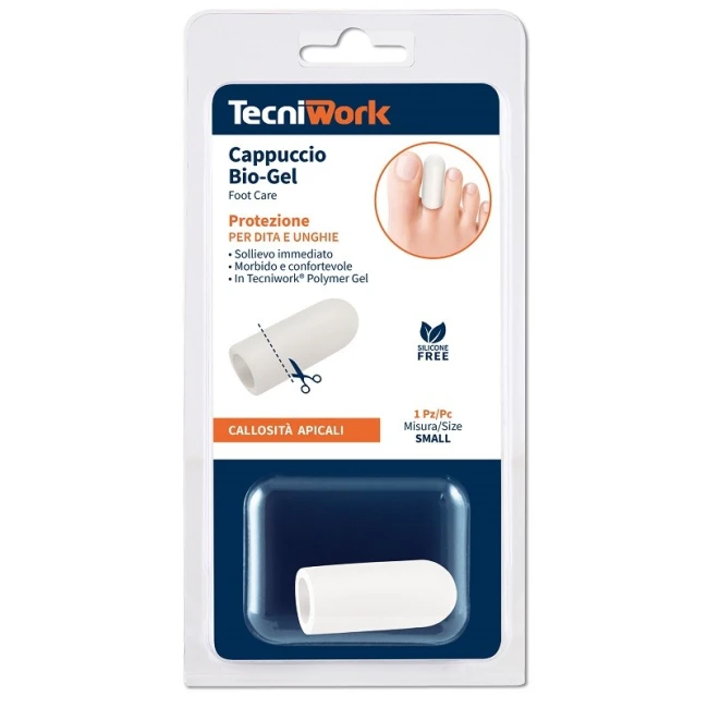 Cappuccio protettivo per dita e unghie in Tecniwork Polymer Gel. Protegge la testa del dito evitando la formazione di callosità, senza creare ingombro. Evita lo sfregamento con la calzatura, previene e dona sollievo in caso di callosità e ispessimenti. Indicato anche per dita a martello, occhi di pernice, calli duri, molli, dorsali e apicali. Dispositivo medico lavabile e riutilizzabile.