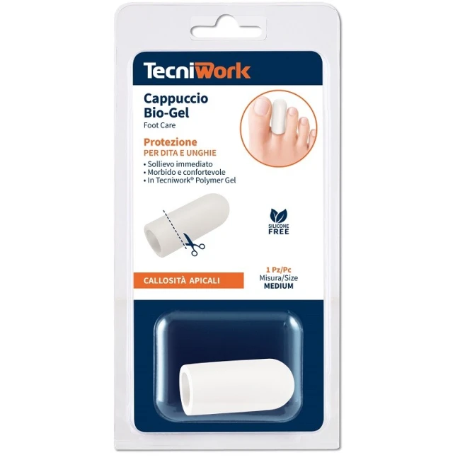 Cappuccio protettivo per dita e unghie in Tecniwork Polymer Gel. Protegge la testa del dito evitando la formazione di callosità, senza creare ingombro. Evita lo sfregamento con la calzatura, previene e dona sollievo in caso di callosità e ispessimenti. Indicato anche per dita a martello, occhi di pernice, calli duri, molli, dorsali e apicali. Dispositivo medico lavabile e riutilizzabile.