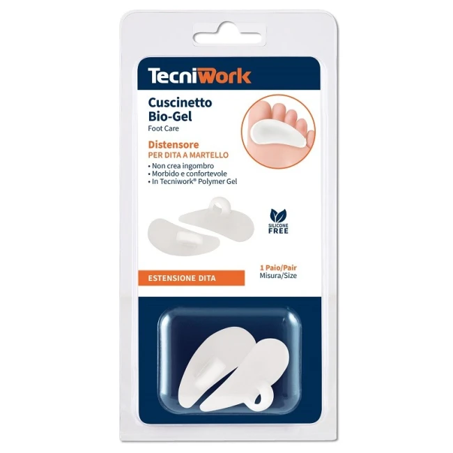Cuscinetto di sostegno per le dita in Tecniwork Polymer Gel. Si applica al 2° o 3° dito e distende le dita evitando lo sfregamento con la calzatura. Ideale contro le callosità del dorso delle dita, indicato anche in caso di dita a martello, a griffe o ad artiglio. Dispositivo medico lavabile e riutilizzabile.