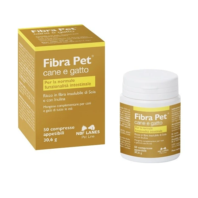 Una compressa di Fibra Pet apporta 227 mg di fibra di soia (di cui 113,5 mg di fibra insolubile) e 50 mg di inulina.