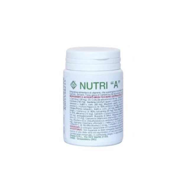 Agente di carica: cellulosa microcristallina, alfalfa (Medicago sativa L.) parti aeree plv, L-carnitina, vitamina C (acido ascorbico), N-acetil-D-glucosamina (deriva da crostacei), calcio citrato, L-istidina, betaina cloridrato, bardana (Arctium lappa L.) radice plv, estratto concentrato di verdure (spinacio, bietola rossa, zucca e carota), magnesio ossido, lino (Linum usitatissimum L.) semi plv, noci (Juglans regia L.) foglie e.s., té verde [Camellia sinensis (L.) Kuntze] foglie e.s. tit. 95% polifenoli, albicocche (Prunus armeniaca L. frutti) estratto concentrato, ananas (Ananas comosus L. Merr.) frutto estratto concentrato, ciliegie (Prunus cerasus L. frutti) estratto concentrato, mirtilli (Vaccinium myrtillus L.) frutti estratto concentrato, more (Morus nigra L.) frutti estratto concentrato, curcuma Curcugreen (Curcuma longa L.) rizoma e.s. tit. 95% curcumina, cardo mariano (Silybum marianum Gaertn.) frutti e.s. tit. 60% silimarina, carciofo (Cynara scolymus L.) foglie e.s., broccoli (Brassica oleracea L. var. Italica) infiorescenze e germogli e.s., zenzero (Zingiber officinalis Rosc.) rizoma e.s.; antiagglomeranti: biossido di silicio, magnesio stearato vegetale; vitamina B3 (nicotinammide), fieno greco (Trigonella foenum graecum L.) semi e.s., camomilla (Matricaria chamomilla L.) fiori e.s., echinacea (Echinacea angustifolia DC.) radice e.s., eleuterococco (Eleutherococcus senticosus Maxim.) e.s., soia [Glycine max (L.) Merr.] semi e.s. tit. 40% isoflavoni (genisteina), valeriana (Valeriana officinalis L.) radice e.s. tit. 0,42% acido valerenico, vitamina B5 (calcio pantotenato), vitamina B6 (piridossina HCl), vitamina B2 (Riboflavina), vitamina B1 (tiamina HCl).